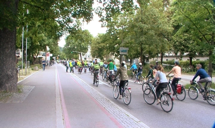 Etwa 60 menschen bewegten sich eine stunde entspannt per fahrrad mitten auf den großen straßen.
